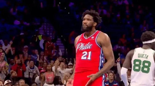 打凯尔特人,恩比德命中了一个平平无奇中距离且造成了对手犯规